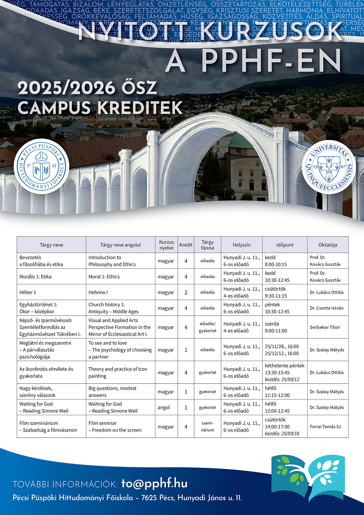 PPHF - "Szerdai Megálló" (ima és lehetőség személyes lelki beszélgetésre) – 2025. október 22. 12:45 - 13:45 – Pécsi Püspöki Hittudományi Főiskola, Pécs, Hunyadi János u. 11, 7625 Magyarország